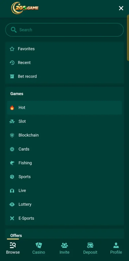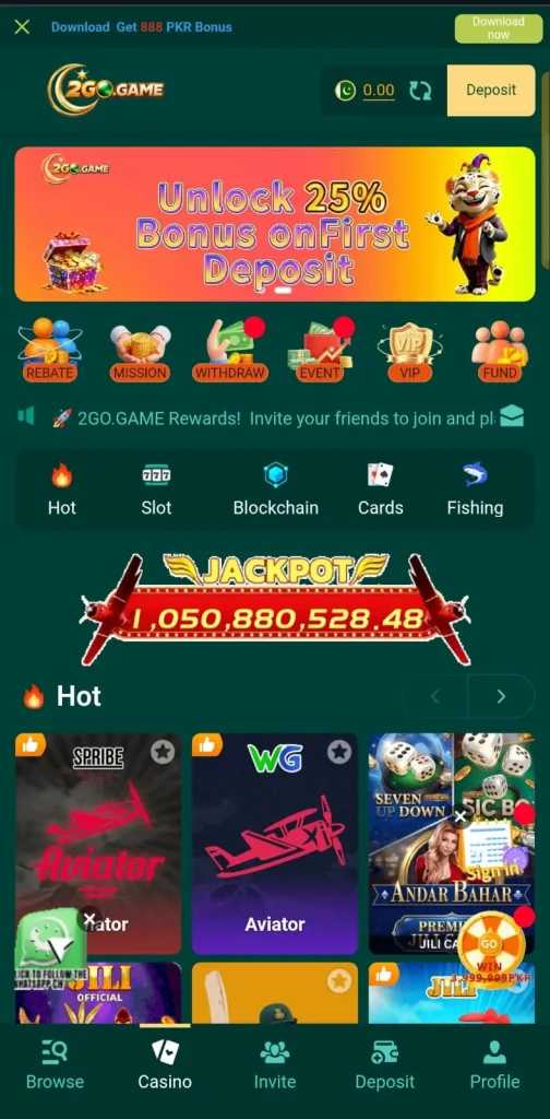 2GO Game is an all-in-one mobile casino and gaming platform designed for users in Pakistan. It offers a variety of games, including slots, card games, lottery draws, fishing games, and sports betting options.